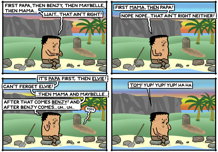 Hmm. Usually, this is where we’d say Tom was “speaking from beyond the grave”. But, he’s clearly no farther away from 3-nipple than the grave itself. So, he’s not “beyond”, but he’s not “in” either, because a grave is a hole in the ground, and there’s no hole anymore. Hmm. On the other hand, Beutel, James definitely has drawn a graven image of him here…